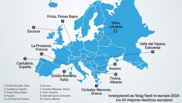 La lista tiene en tercer lugar la provincia de Frisia, en los Países Bajos y, en especial, su capital, Leeuwarden. Siguen, en cuato y quinto lugar, Kosovo y La Provenza francesa, respectivamente.El resto de puestos los ocupan, en orden descendente, Dundee, en Escocia; las Cícladas Menores, en Grecia; Vilna, la capital lituana; el Valle del Vipava, en Eslovenia; y, por último, otra capital, Tirana, de Albania.